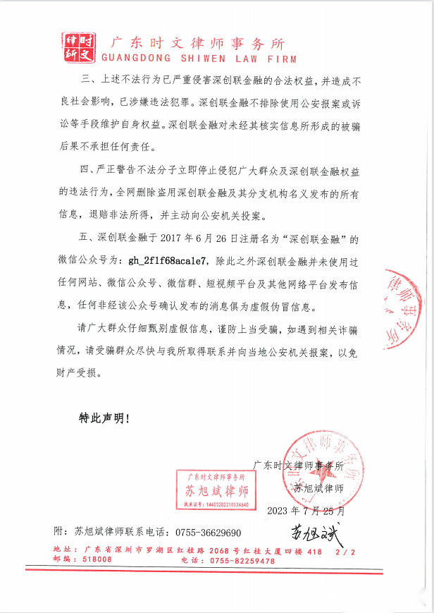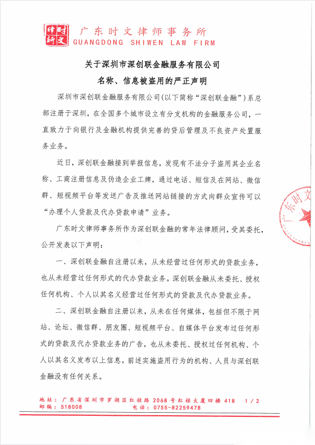 近期,网络出现冒充我司(深创联金融)名义,以放贷、理财等借口,诈骗钱财、谋取非法利益的事情,严重损害了我司商誉。我司发表声明如下: